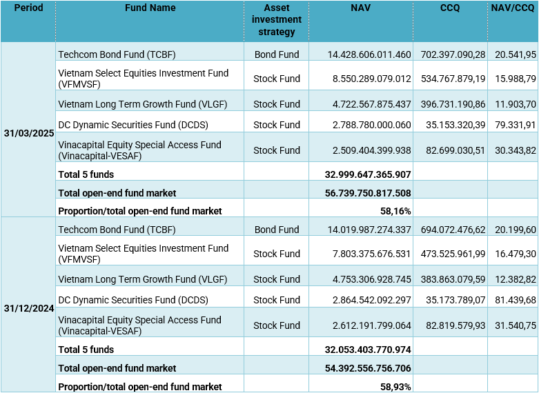 - The total asset size of the open-end fund market as of March 31, 2025 is approximately VND 56,739.75 billion, specifically as follows: